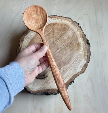 Pricing depends on the size, details, and customization. I'll outline options and costs before carving so there are no surprises. Most custom spoons end up in the $50 - 100 range, depending on the details involved. Payment isn't due until you see and approve the finished spoon.