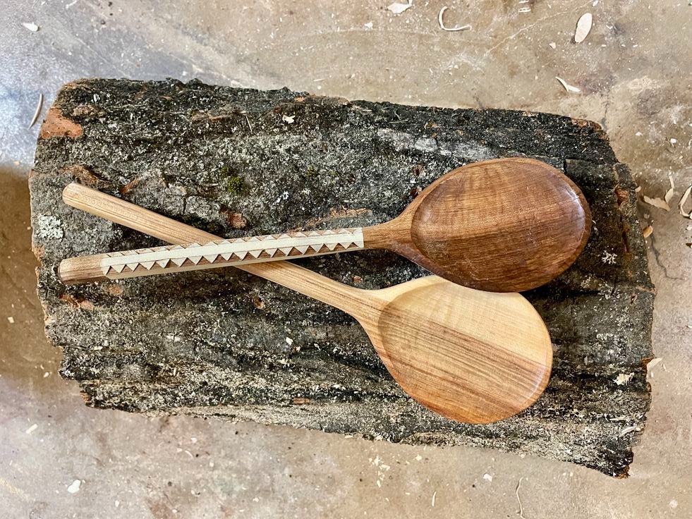 Hand carved wooden spoons honoring local trees and community. Made in the USA .