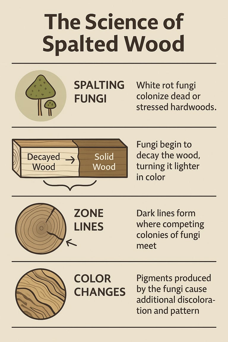 This short technical guide from the USDA Forest Products Laboratory explains how spalting forms, which fungi create zone lines, and how woodworkers can identify safe, structurally sound pieces. It’s one of the clearest research-backed overviews available for anyone interested in the craft and science behind spalted wood.🔬 Read USDA Forest Service materials on wood decay and fungal ecology — These publications explain how fungi move through fallen trees, why certain species spalt more dramatically, and how environmental factors shape the appearance of spalted wood.