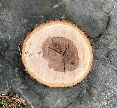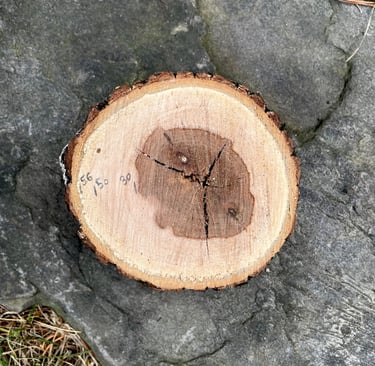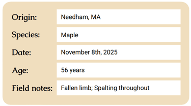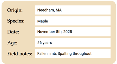 This maple limb was found after a storm in my local neighborhood here in Needham, Massachusetts. At an estimated 56 years old, its rings tell the story of decades of growth, and its spalting creates patterns that only Mother Nature herself could paint. (Read more about the magic alchemy of spalting in my blog!)