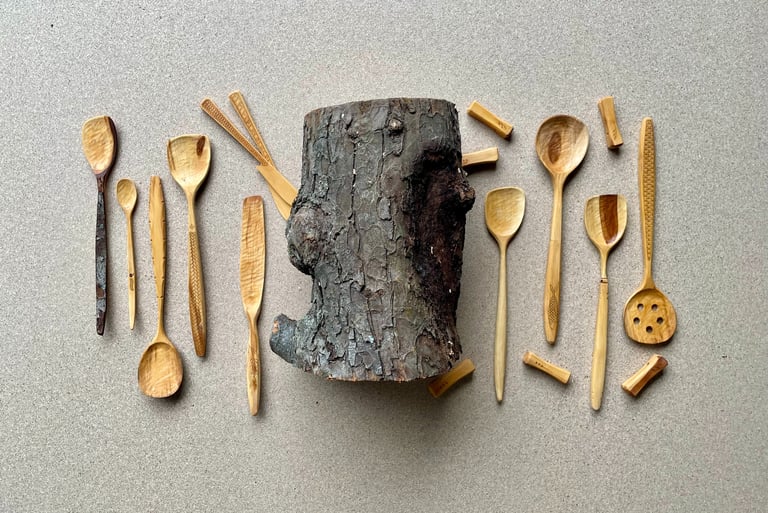 From this roughly 3-foot-long, 7-inch-diameter log, I’ve hand-carved five spoons and two spurtles. Each piece is one-of-a-kind—a tangible connection to the tree, the storm that brought it down, and the craft of spoon carving that brings its story to life.